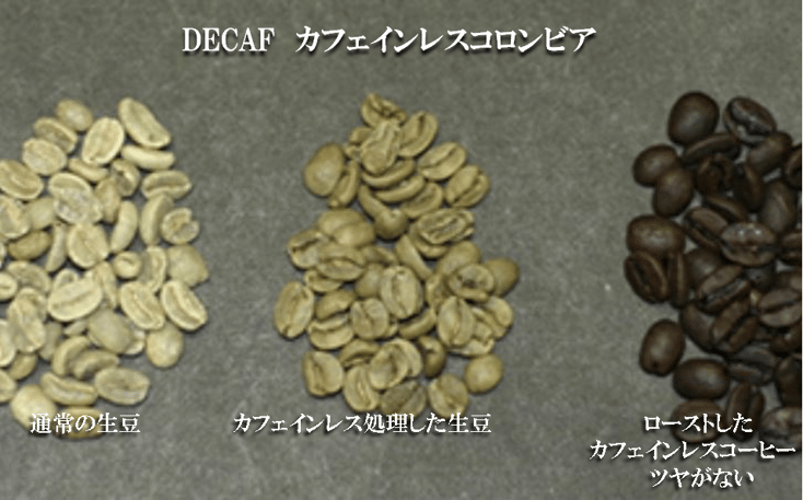 カフェイン自体の味は苦味でコーヒーの苦味の最大で10%程度影響していると言われていますので、その分少しだけ深煎りにしております。(画像の左側より、通常の生豆、カフェインレス処理した生豆、ローストしたカフェインレスコーヒー・ツヤがない)
