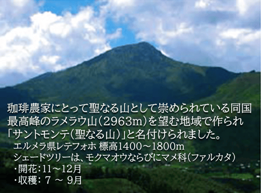 コーヒー農家にとって聖なる山として崇められている同国最高峰のラメラウ山(2963m)を望む地域で作られていることから「ティモール・サントモンテ(聖なる山)」と名付けられました。東ティモールの山岳地帯は、日中の強い日差しに比べて朝晩は冷え込み、温度差があります。年間降雨量も2000ミリ以上と美味しいコーヒーを作るための自然環境に恵まれ、国民の1/4がコーヒー生産に従事し、そのほとんどが小規模農家です。栽培から精製までの大部分を手作業にて丁寧に行われています。栽培や精製の技術指導を受け、生産者の品質管理に対する意識も上がり、東ティモールコーヒーの品質は向上してきています。
